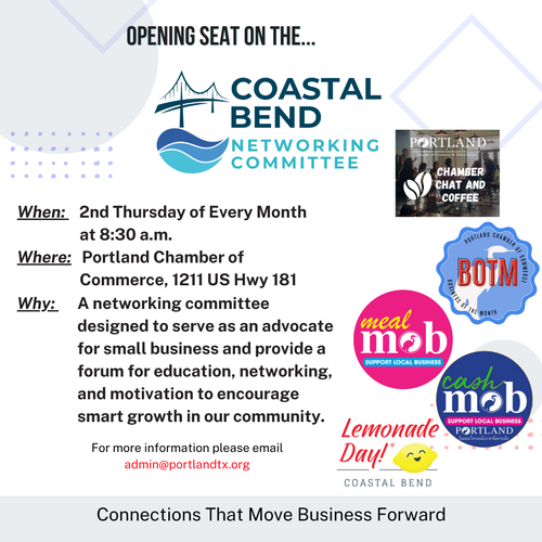 Mission Statement 'Coastal Bend Networking Committee':'The Coastal Bend Networking Committee will sponsor a variety of educational and entertaining events, workshops and forums that assist businesses in their overall performance and ultimately the business climate of our community.'