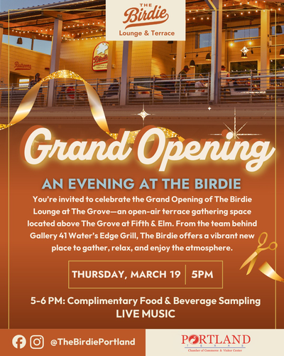 You're invited to celebrate the Grand Opening of the Birdie Lounge at The Grove-an open-air terrace gathering space located above the Grove at Fifth & Elm. From the team behind Gallery 41 Water's Edge Grill, The Birdie offers a vibrant new place to gather, relax, and enjoy the atmosphere. Enjoy complimentary Food & Beverage Sampling and Live Music