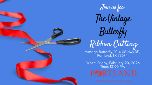 PLEASE JOIN US FOR OUR GRAND OPENING RIBBON CUTTING CEREMONY ON FRIDAY FEB 20TH AT NOON with REFRESHMENTS AND DOOR PRIZES! COME SAY HELLO TO OUR NEW MEMBER, VINTAGE BUTTERFLY LOCATED AT 1014 US HWY 181, PORTLAND, TX.
